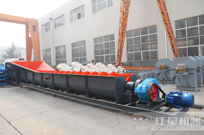 2、螺旋洗石機體型較長,采用臥式結(jié)構(gòu)布置,處理量也更大,多用于大型砂廠,該設(shè)備使用螺旋推進(jìn)石子而使石子與水和泥土分離,因而石子干凈但產(chǎn)量略低。